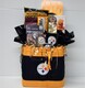 Every Pittsburgh Steelers football fan will this basket. It is built in a Steelers lunch tote. It contains Pittsburgh Steelers mints,coasters, playing cards, mug, and license plate. Along with Pittsburgh Pretzels, Trello's chocolate Steelers bar, cheese crisps, caramel popcorn and coffee.